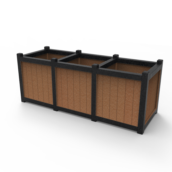 These triple planter boxes are made from DuraLumber™ to stand up to outdoor elements while being virtually maintenance-free. DuraLumber™ is made from recycled plastic.